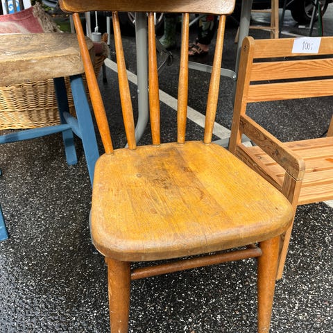 Fin bedstemor stol i børne størrelse. Sædehøjde 28 cm højde fra gulv til top 56 cm. Vipper en lille bitte smule. Kan afhjælpes med en filt dut under det ene ben.
