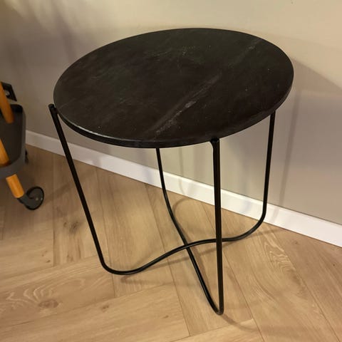 Rundt sidebord lavet af marmor med hvid og grå farvetone. Bordet har en cirkulær bordplade og en stabil base i samme materiale. Velegnet som sidebord i stue eller opholdsrum.