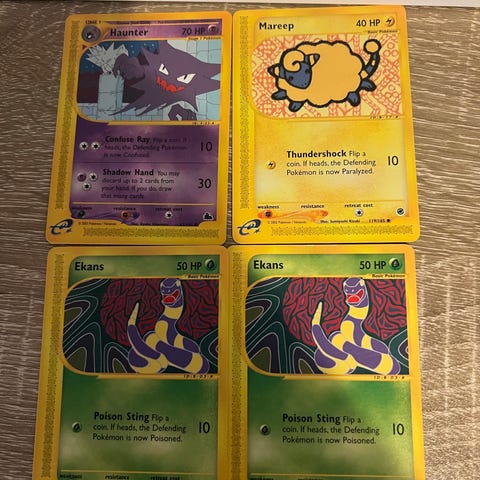 Mange Pokémon samlekort i en blandet pakke med forskellige korttyper og motiver.