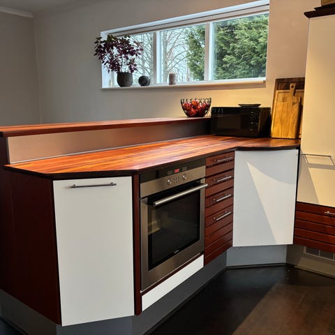 - Gulvstående modul mod væg: L230xB70xH92 cm med nedfældet kogeplade (Miele induktion 90 cm) og fire meget store og rummelige skuffer