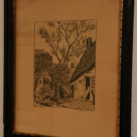 Billedet har taget lidt fugt i kanten af bunden samt i højre side, uden at berøre selve kunstværket.