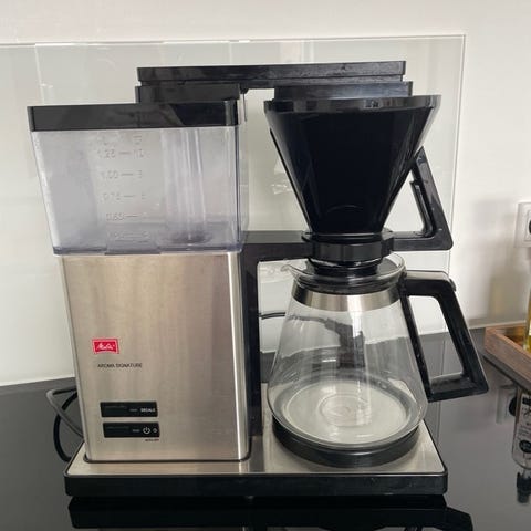 Melitta AromaFresh kaffemaskine med integreret kaffekværn og glas kande. Maskinen har funktioner til at brygge frisk kaffe med kværn, og den er designet med rustfrit stål og sort plast. Velegnet til hjemmebrug.
