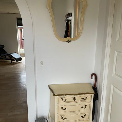 Retro / antik. . kommode med tilhørende vægspejl. Kommoden er malet i cremefarve og har håndmalede blomster på fronten. Den har en skuffe og to låger med opbevaringsplads indeni. Kommoden har et dekorativt og klassisk design med let buede kanter. Spejlet har en ramme i samme farve som kommoden. Mindre brugsspor og afskalninger ses på kanterne.