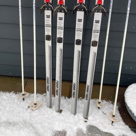 Langrende ski er hhv 208cm , 195 og 175cm i længde. Det korteste ski (175) har defekt på bagerste ende af det ene ski.