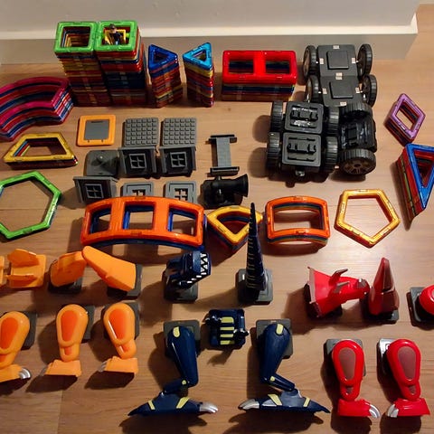 IKKE GEOMAG. Movin' Monkeys byggesæt med forskellige farvede plastikdele og gear til leg og konstruktion. Sættet indeholder flere komponenter, herunder gear, klatredele og instruktioner, som kan bruges til at bygge bevægelige strukturer med abe-tema. Velegnet til børn til kreativ og motorisk leg. Kun brugt er 2 gange og er som sprit nyt.