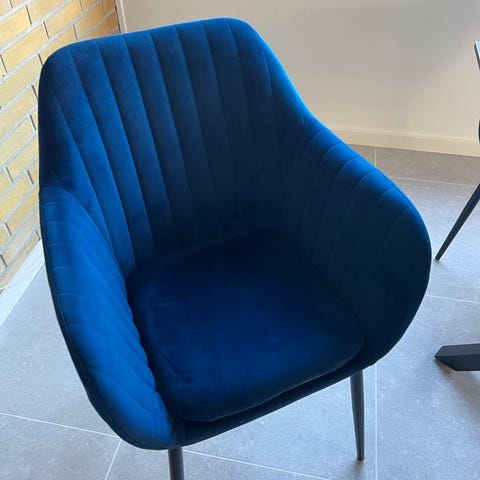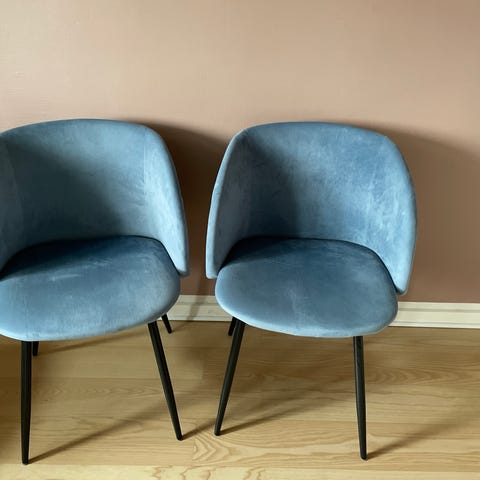 Blå velour stole med stål ben i farven eg.