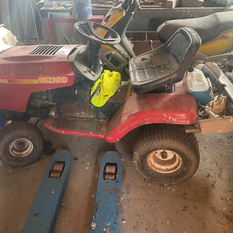 Havetraktor med monteret kost med en diameter på cirka 30 cm. Udstyret med benzinmotor og styrehåndtag. Anvendelig til rengøring og oprydning af udendørsarealer.