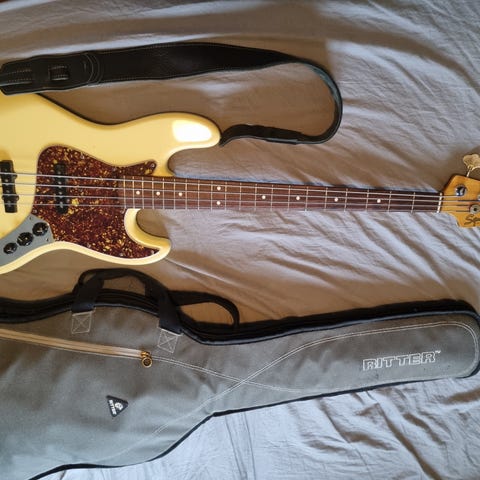 Originale pickupper samt stol haves og følger naturligvis med - men begge er opgraderet til Lollar P-bass pickupper og Fender Hi mass