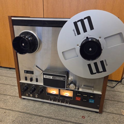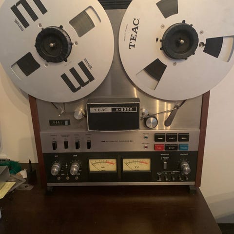Teac A-7300-2T spolebåndoptager, Two Track Two Channel med direct drive capstan og IC logic control. Udstyret med forskellige knapper og drejeknapper til hastighed, cue og pitch control. Indeholder analoge målere og tilslutninger til eksternt udstyr. Leveres med en Teac båndspole monteret, mikrofon, fjernbetjening og 32 AGFA spoler