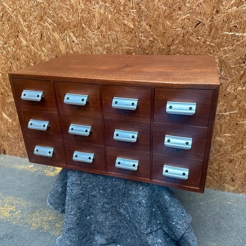Arkivskab i teaktræ,med 6 skuffer/udtræksbakker,der kan isættes efter behov.
