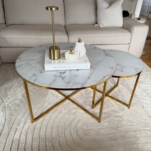 Bordpladerne er af glas med marmor look så de er nemme at holde