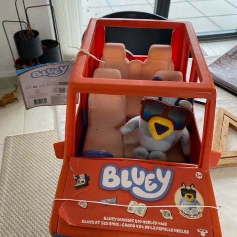 Bluey Granny Vehicle legetøj med en lille figur. Legetøjet er designet til børn fra 3 år og op. Det inkluderer en lilla og grøn bil samt en farverig figur med briller. Produktet er egnet til rolleleg og kreativ leg med Bluey-tema.