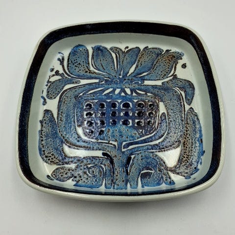 Skålen har en firkantet form med bløde kanter. Den viser et detaljeret blomstermønster i blå nuancer med brune elementer. Keramik.