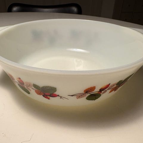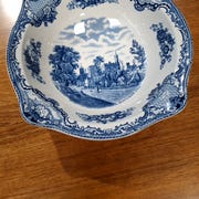 Skålen er detaljeret dekoreret med et landskabsmotiv. Den er lavet af keramik.