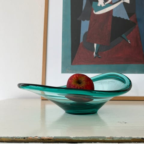 Skålen er lavet af klart glas med et elegant, indgraveret mønster af frugter og blade.