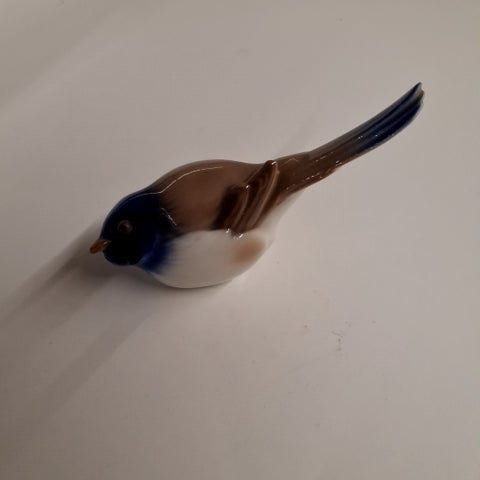 Produktet er en glasfigur af en fugl med en glat overflade. Den har bløde former og detaljeret farvning. Dens krop er i beige nuancer, mens hovedet og halen er i blå.