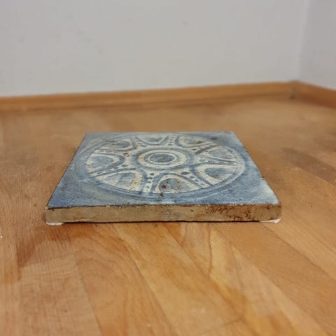 Produkterne er fliser med detaljeret bygningstegning og blå farver. Keramisk.