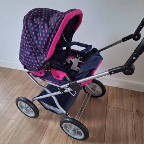 Vuggen har en blå, flettet struktur og en stofbetræk. Den har metalhjul og en skjold.