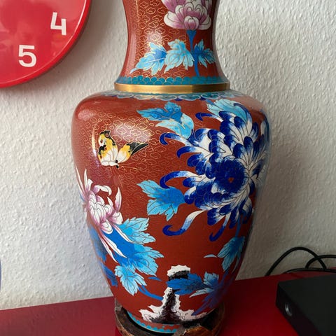 Vasen har en slank form med en bred bund og en smal hals. Den er dekoreret med blomster.