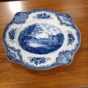 Serveringsfad med dekoration i blått og hvidt. Porcelæn.