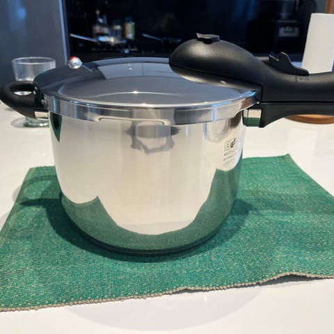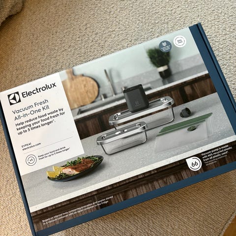 Produktet er en smart køkkenenhed med en sort, rund base og en slank, metal-ledning. Indeholdt er en hurtigstartvejledning.