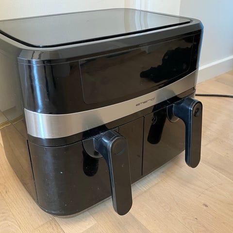 Emerio Smart Airfryer med dobbeltkurv 9,4 kg samt 2 enkelte skuffer. Kilowatt 2400. Den er hurtig. Den er super god til en familie. Jeg kan fortælle skuffen på 9,4 L koster 400,00, Så det er et rigtig godt tilbud.