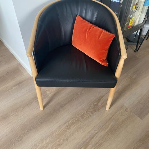 Eksklusiv Stouby Lux lænestol betrukket med sort Madrid semianilinlæder. På Lux-modellen er læderhynden udført, så den går helt ud til armlænene, hvilket giver et elegant og sammenhængende udtryk.