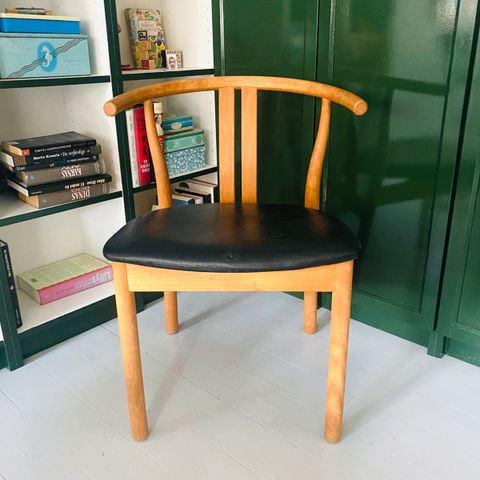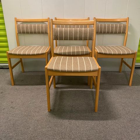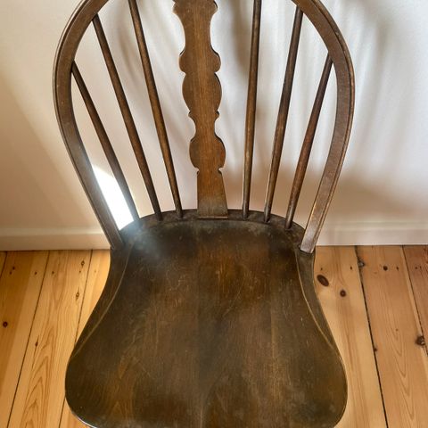 Stolen er fremstillet i bøgetræ og har et rygdesign med tremmer og et polstret sæde i stof.