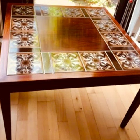 Bordet har en oval form med en kombination af stenplader og træ. Det har en solid konstruktion.