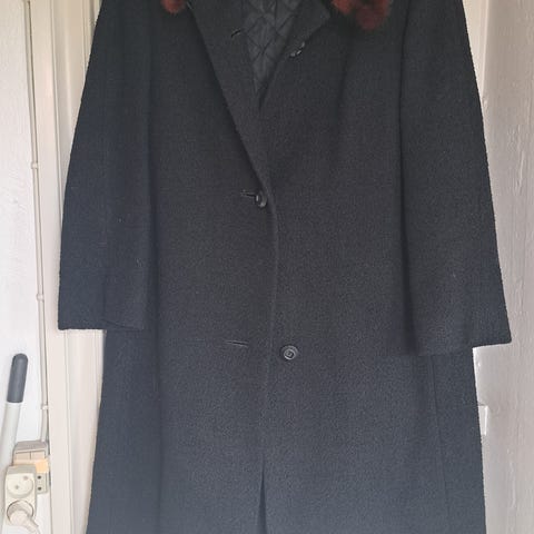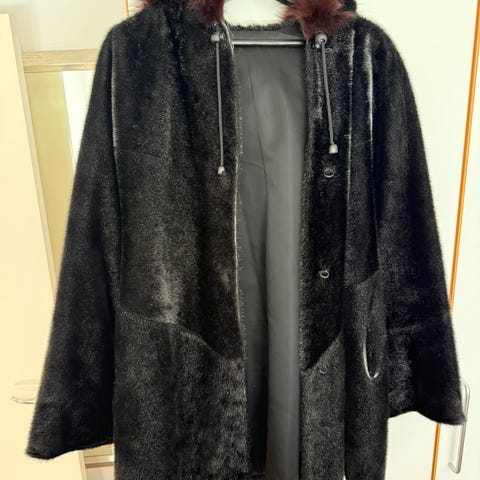 Frakken er i pels med en blød og luksuriøs tekstur. Den har en klassisk krave og lange ærmer.