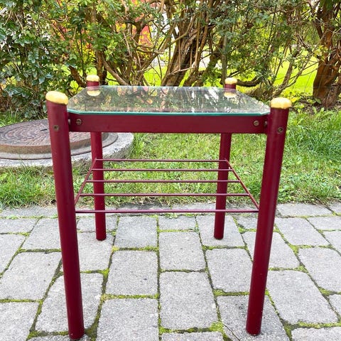 Bordet har en glasplade og metalben med en moderne, minimalistisk stil.