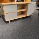 Møblet er velholdt og fremstillet i eg. Tre låger, hvoraf den midterste har rude medblyindfattet farvet glas.