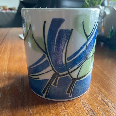 Kruset fra Royal Copenhagen er af fajance. Det har et dekorativt design med blå og grønne elementer samt året 1981. Designet af Ellen Malmer.