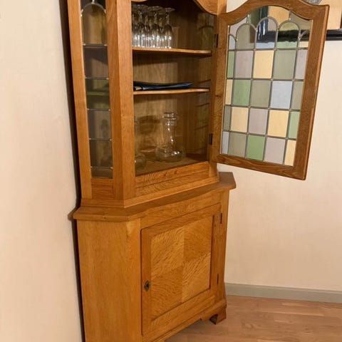 Skabet er lavet af lyst træ med fine udskæringer. Det har en skuffe og ben.