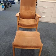 Stolen har en grå polstret sæde med en træramme. Enkel og moderne design.