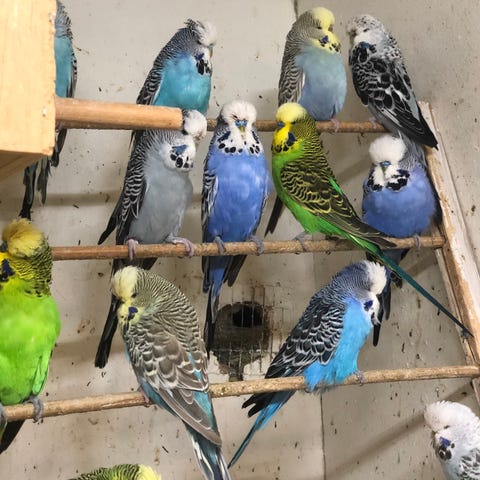 8 stk i kold voliere hunner 200 kr hanner 150 kr, samlet salg 100 kr stk, der er blå grøn grå carry farvet