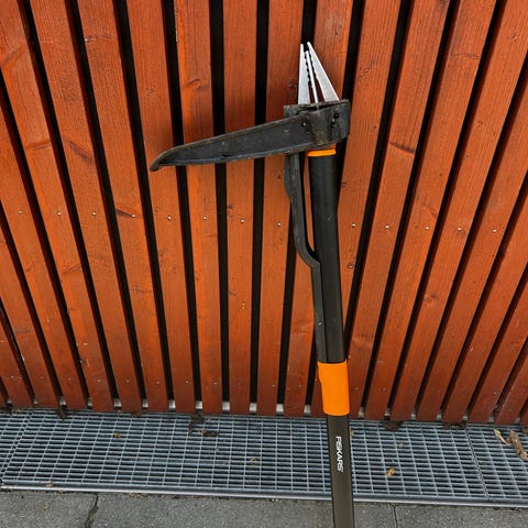 Produktet er et haveredskab med en lang, sort metalstang og en orange gummihåndtag.