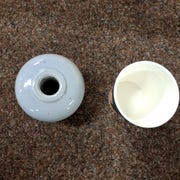 Lysestage er lavet af keramik og har en glat, hvid overflade. Den har en skulpturel form med to kugler.