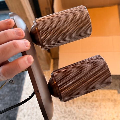 Produktet har en glat, rund form og er lavet af hvid porcælæn. Derudover har det et metaludtag til strøm.
