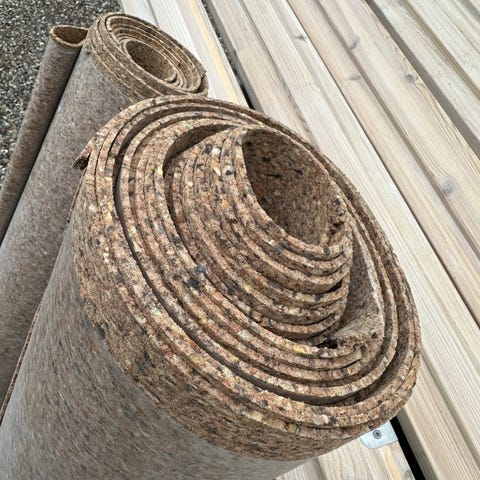 Produktet er belagt med kork granulat med en vægt på 0,8 kg/m². Størrelsen er 1,0 x 15,0 m.