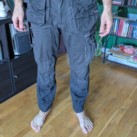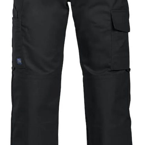 Bukserne har en cargo-stil med flere lommer og en afslappet pasform. Materialet ser ud til at være slidstærkt.
