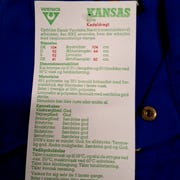 Produktet er en arbejdsdragt med justerbare stropper og en kombination af knapper og lynlås. Det er fremstillet af slidstærkt stof med en klar blå bundfarve og gule detaljer.