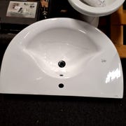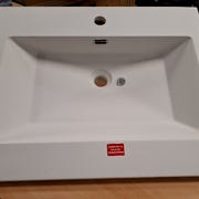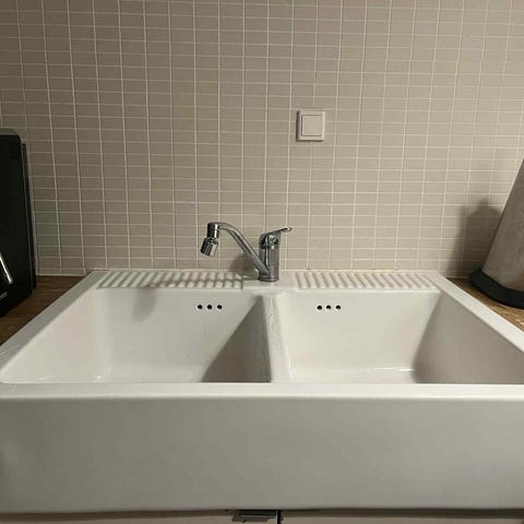 Vasken har to håndvaske med afrundede former og en glat overflade.