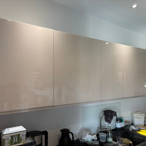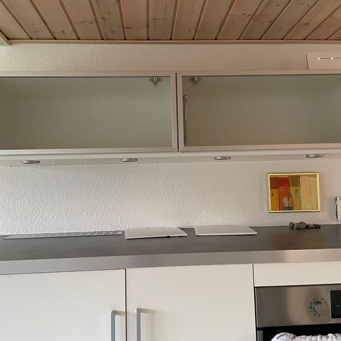 Vi har mange forskellige skabe på lager, det viste overskab koster 350 kr. Kom og kig