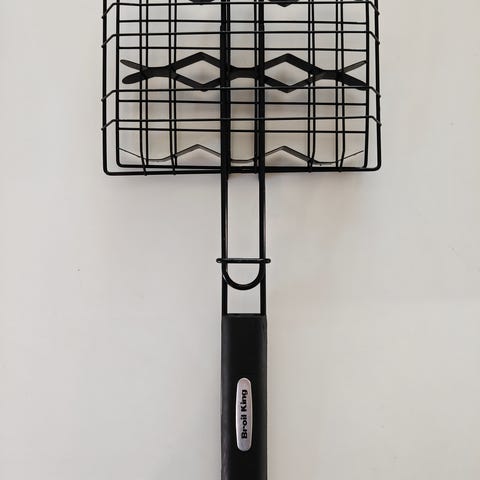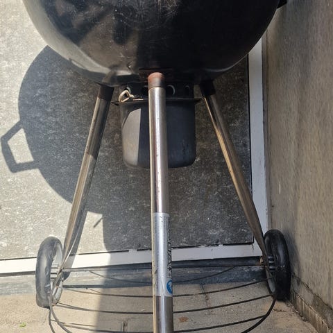 Grillen har en rund form med en skinnende, blå emaljeoverflade. Den står på en metalstativer. Diameter 38 cm.