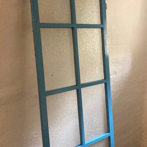 Døren er lavet af ubehandlet træ med synlige åre- og knudestrukturer. Den er beskyttet af plast.