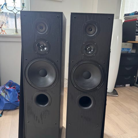 Fejler intet og spiller forrygende. Der medfølger fronte, men de er uden stof, så kan man selv vælge front farve. Kan naturligvis høres inden køb, sælges billigt, da de står lidt i vejen :o)