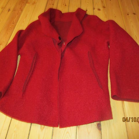Lækre nye figursyede filtjakker i rød eller turkis str. L med kunstnål man kan samle den med, som kan flyttes. Perfekt til hverdag og fest. Dejligt varme. Købt for 1000kr.. Sælges for 200kr./stk. Med samlet køb af de to filtjakker: 375kr. Kan sendes på købers regning. Billigst med GLS: 43kr..