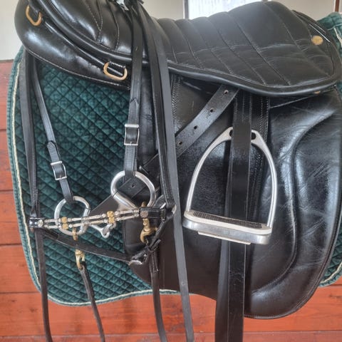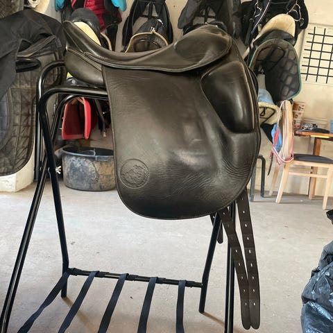 Ukendt sort læder sadlen med polstret sæde og justerbare stropper. Sadlen er designet til ridning og passer til forskellige hestetyper.