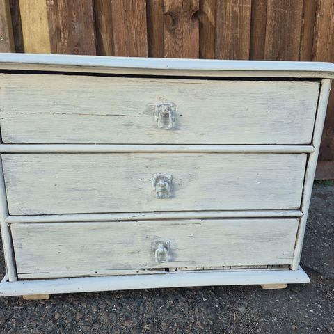 Kommoden har synlige brugstegn men fejler intet. Perfekt til en upcycling eller som den står i strålende lilla farve.